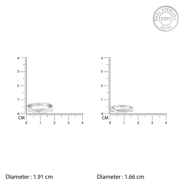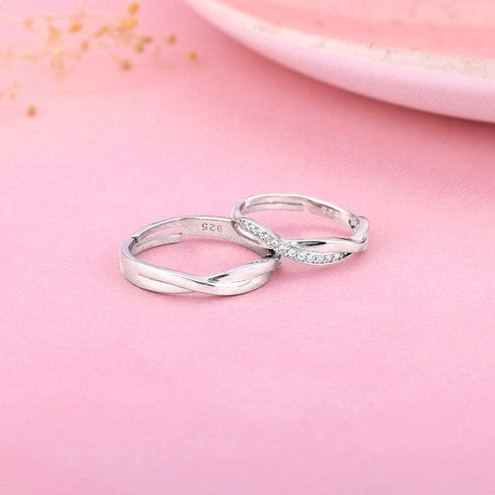 These silver rings feature a twisted design, the women's ring is adorned with zircons while the men's ring has a plain pattern.