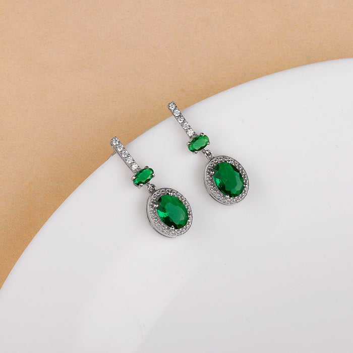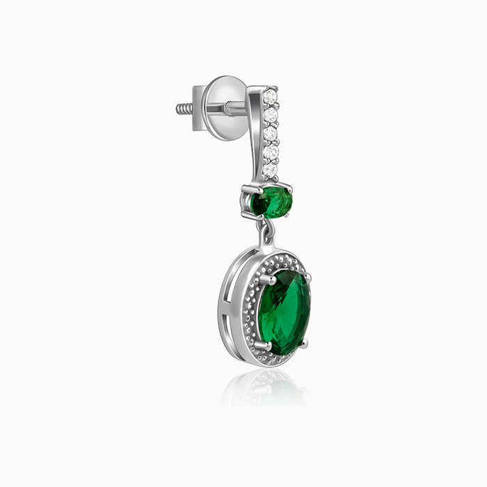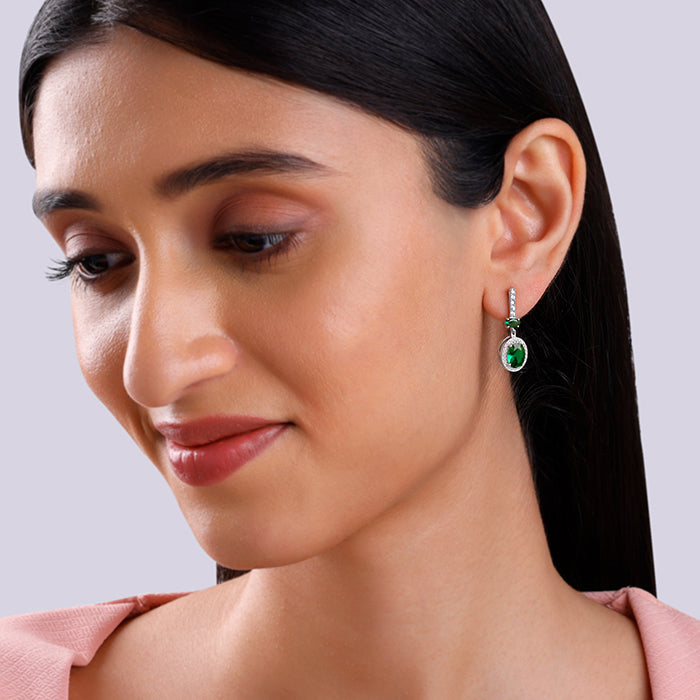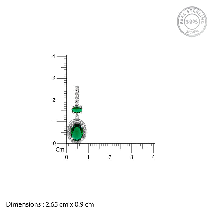 These silver earrings for women feature an upper dangle, vertically lined with zircons, followed by an oval green coloured stone. The lower dangle has an oval shape with zircons lining its rim and a green coloured stone at the centre.
