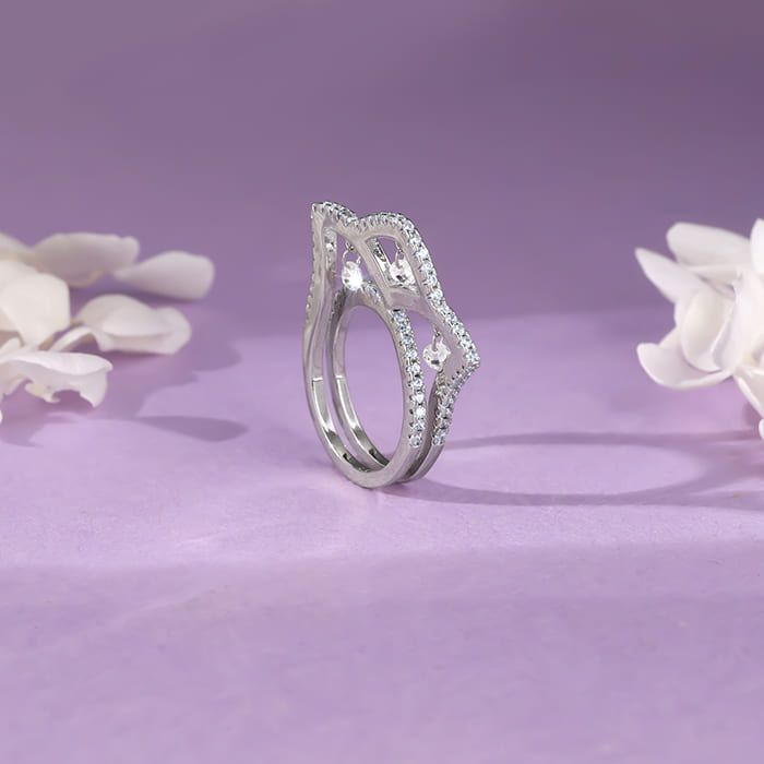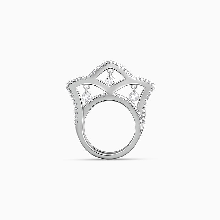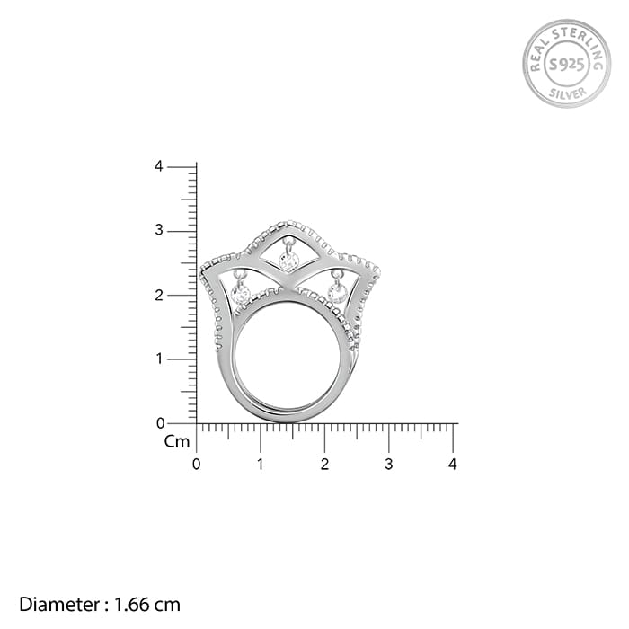This silver ring features a 3D crown motif set with zircons studded nestling zircon charms.