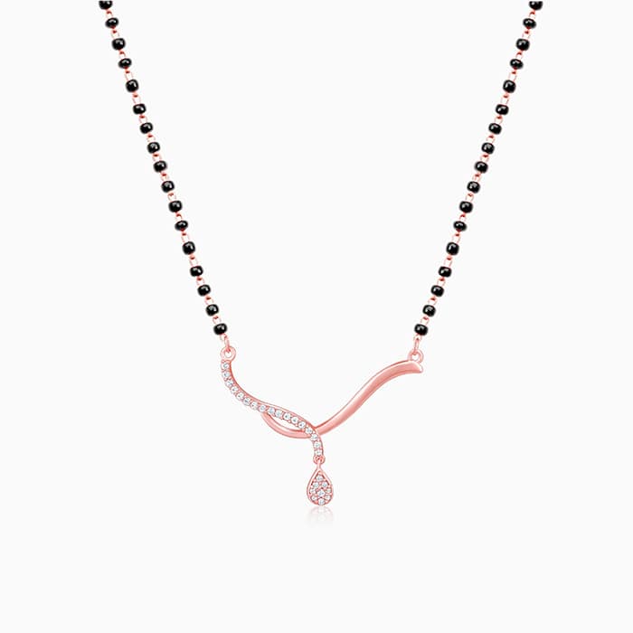 The gorgeous rose gold mangalsutra is stylishly forward while rooted in tradition. Black beaded chain end with a plain layer twirl of rose gold overlaps with another layer studded with zircons. It is connected with a drop motif that dangles from the centre.