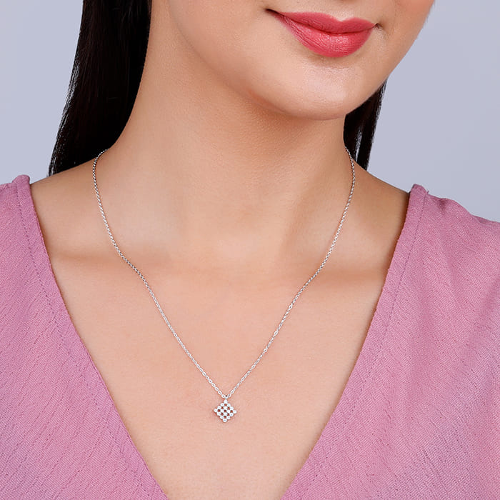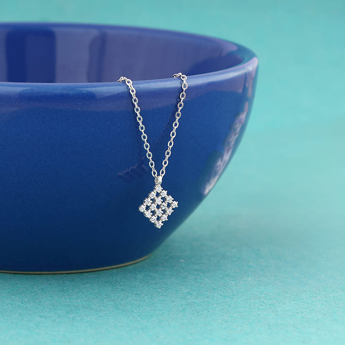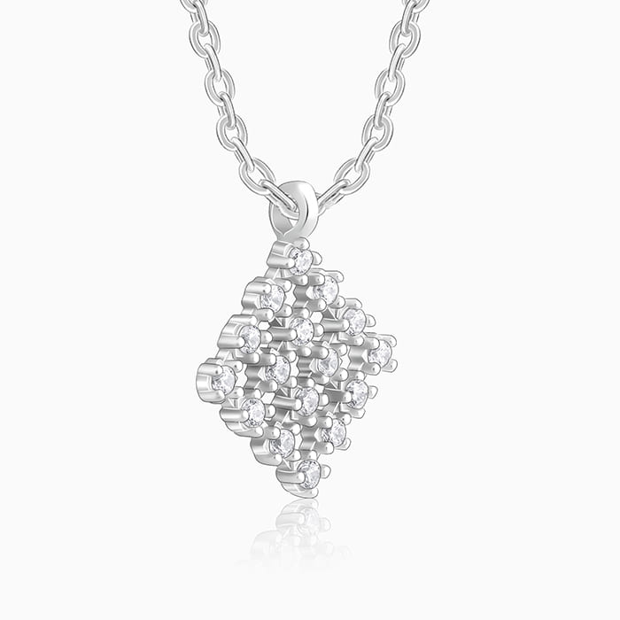 This silver pendant features a rhombus motif studded with zircons.