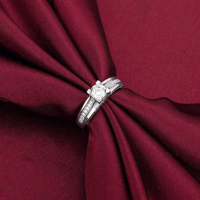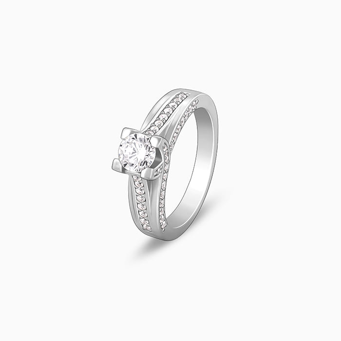 This silver ring features a trellis head nestling a circular zircon on a band that has zircons on top and sides of the shank.