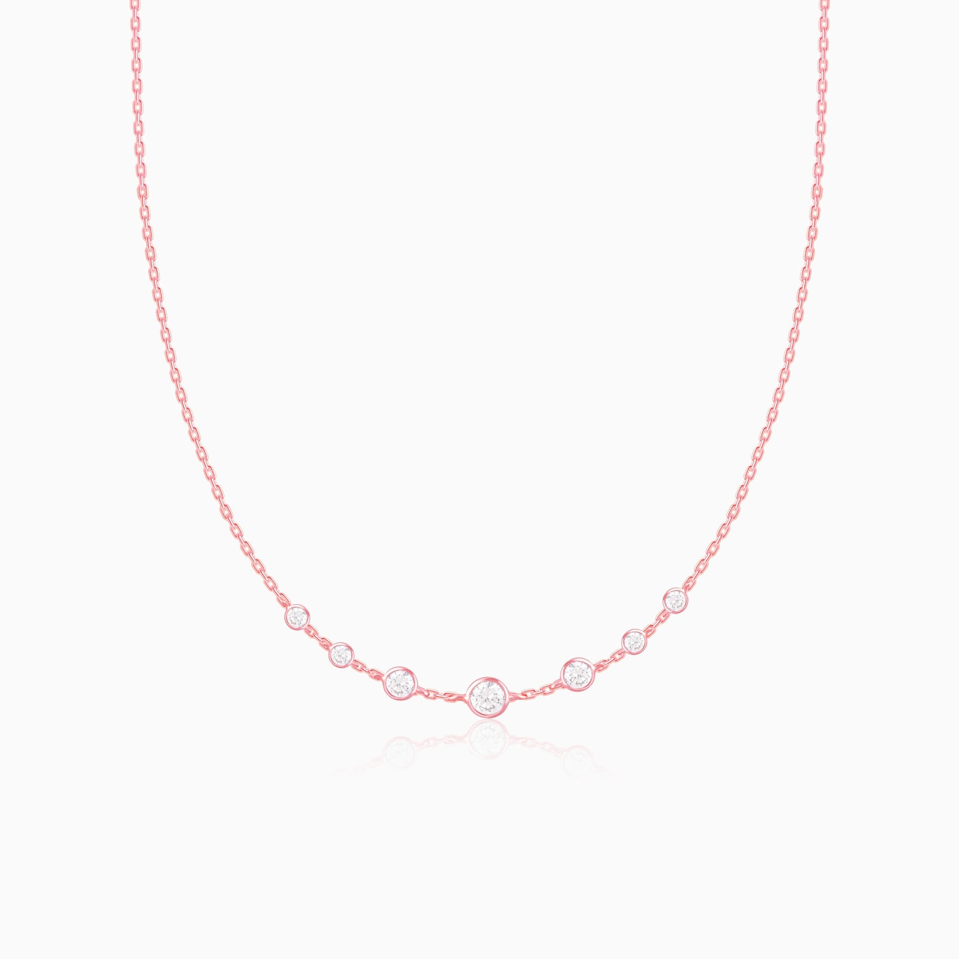 The rose gold necklace features a circular motif design of various zircon stone sizes arranged in a harmonious manner.