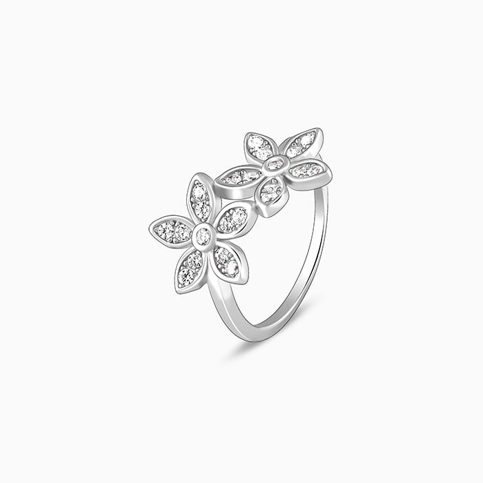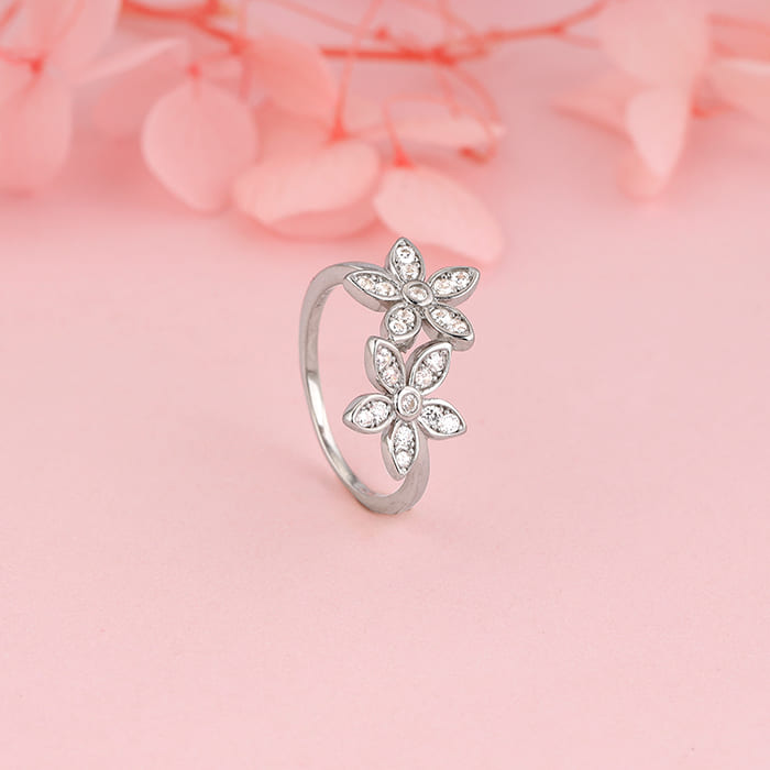 This silver ring has a dual flower motif studded with zircons in the centre.