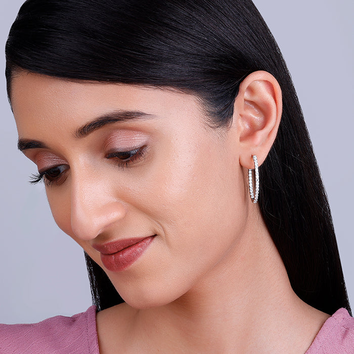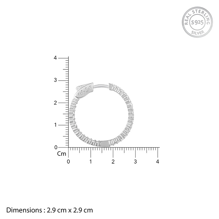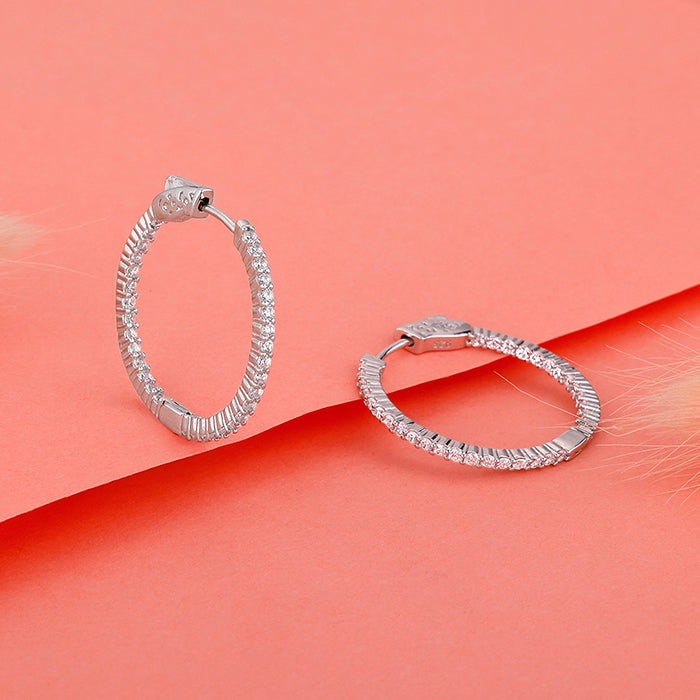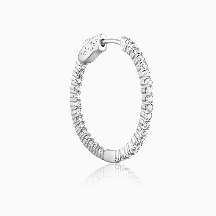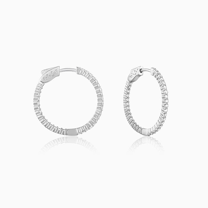 These silver earrings feature a hoop design studded with zircons in the inner and outer hoop layers.